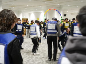 まずは、チームの仲間全員が制限時間内にフラフープを潜り抜けるフラフープくぐりリレーを行いました!〇