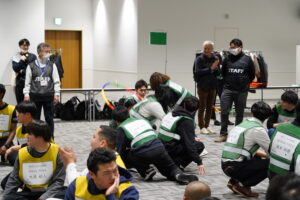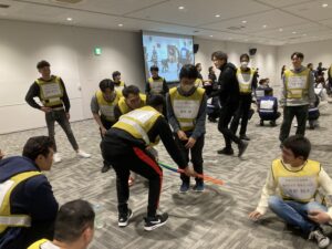 まずは、チームの仲間全員が制限時間内にフラフープを潜り抜けるフラフープくぐりリレーを行いました!〇