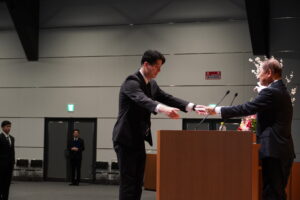 安藤社長から歓迎のお言葉をいただき、続いての辞令授与では、各業種の代表6名が受け取りました。