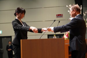 安藤社長から歓迎のお言葉をいただき、続いての辞令授与では、各業種の代表6名が受け取りました。